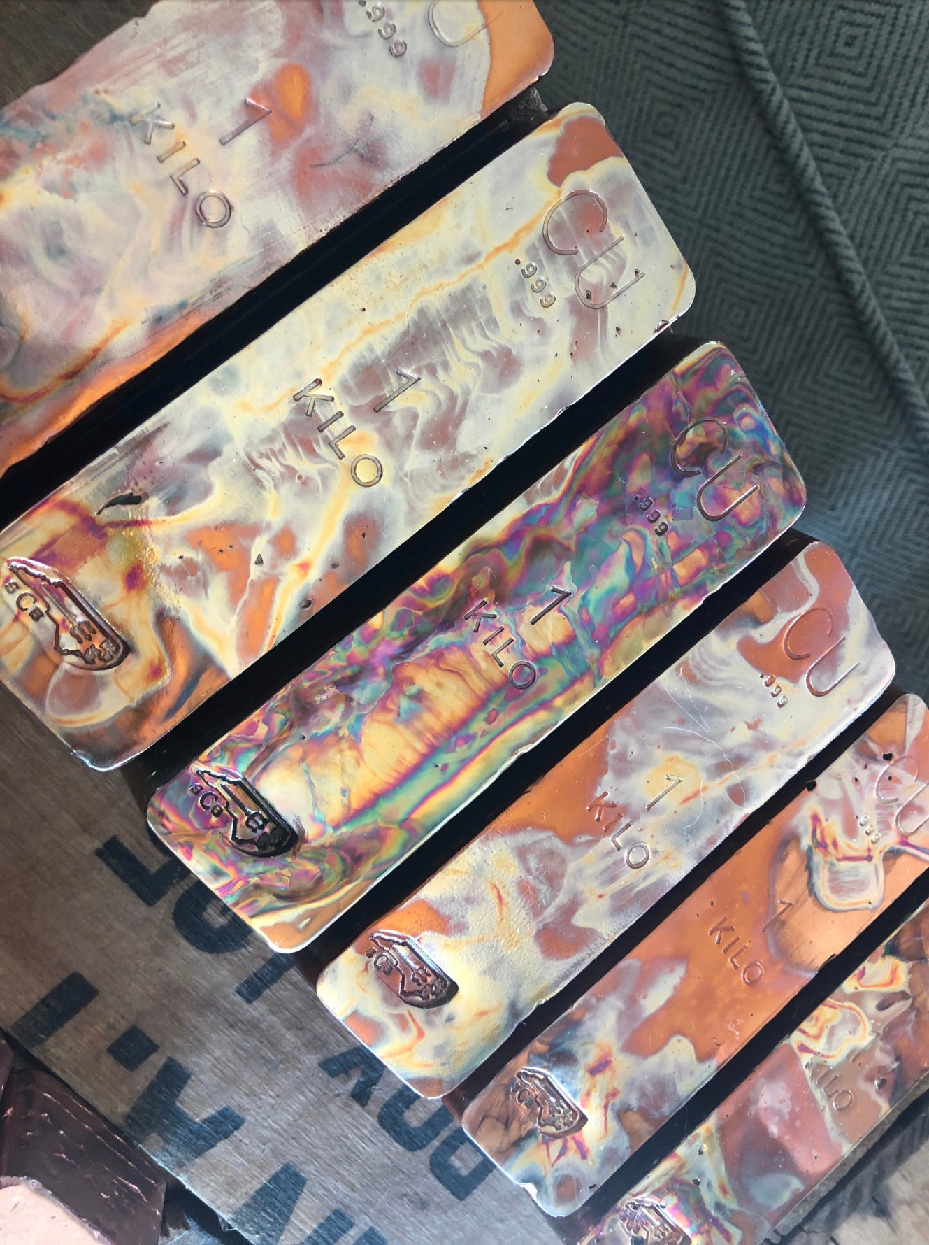 All bars are custom cast, hand poured , and hand worked . Heat painting is a technique of bringing out colors in the copper using heat in a painting technique. Incredibly tricky to do correctly the end results are absolutely gorgeous. No two bars are ever exactly the same