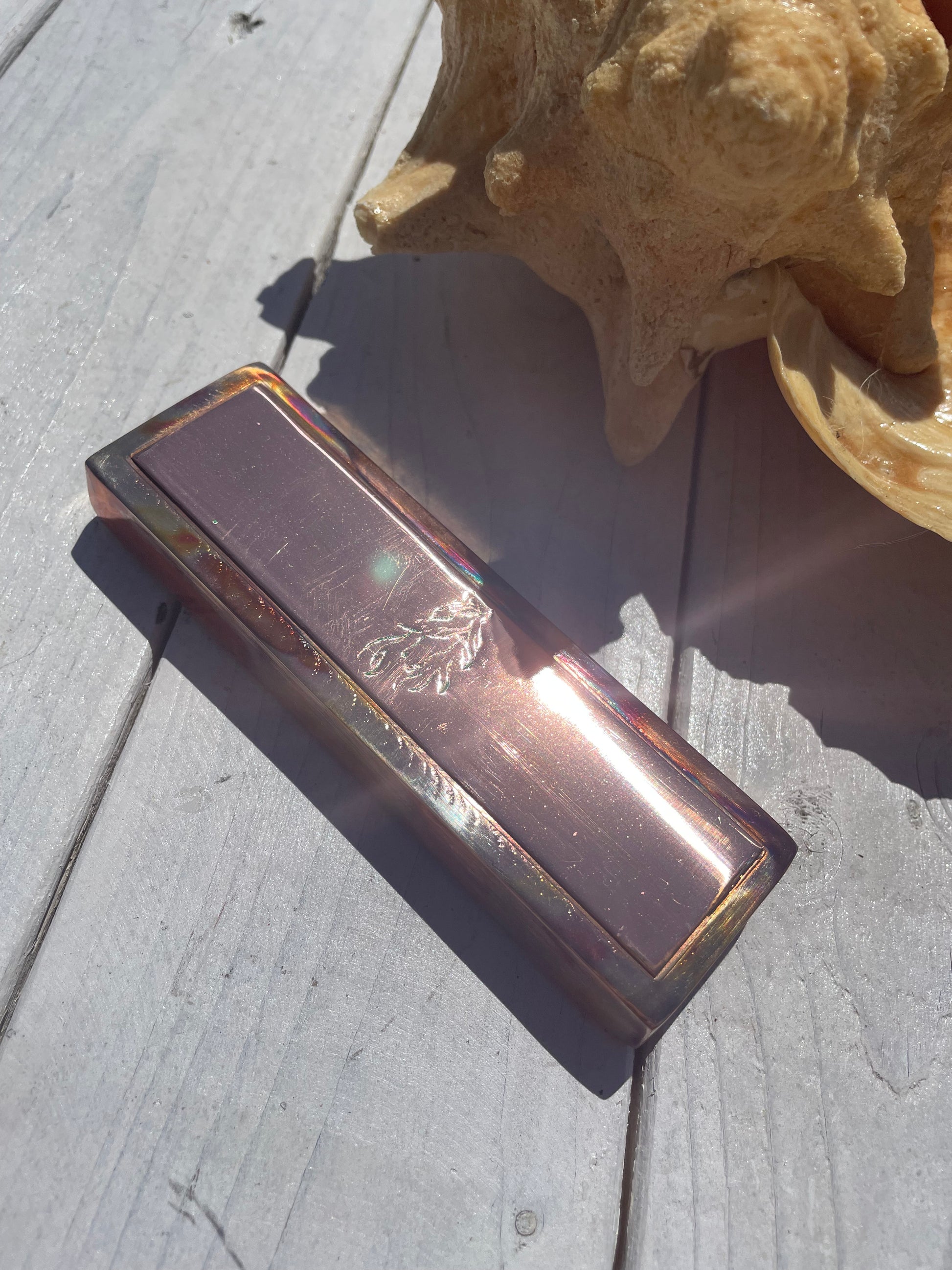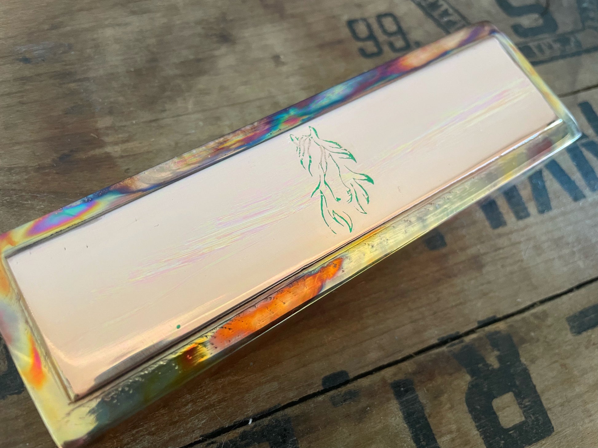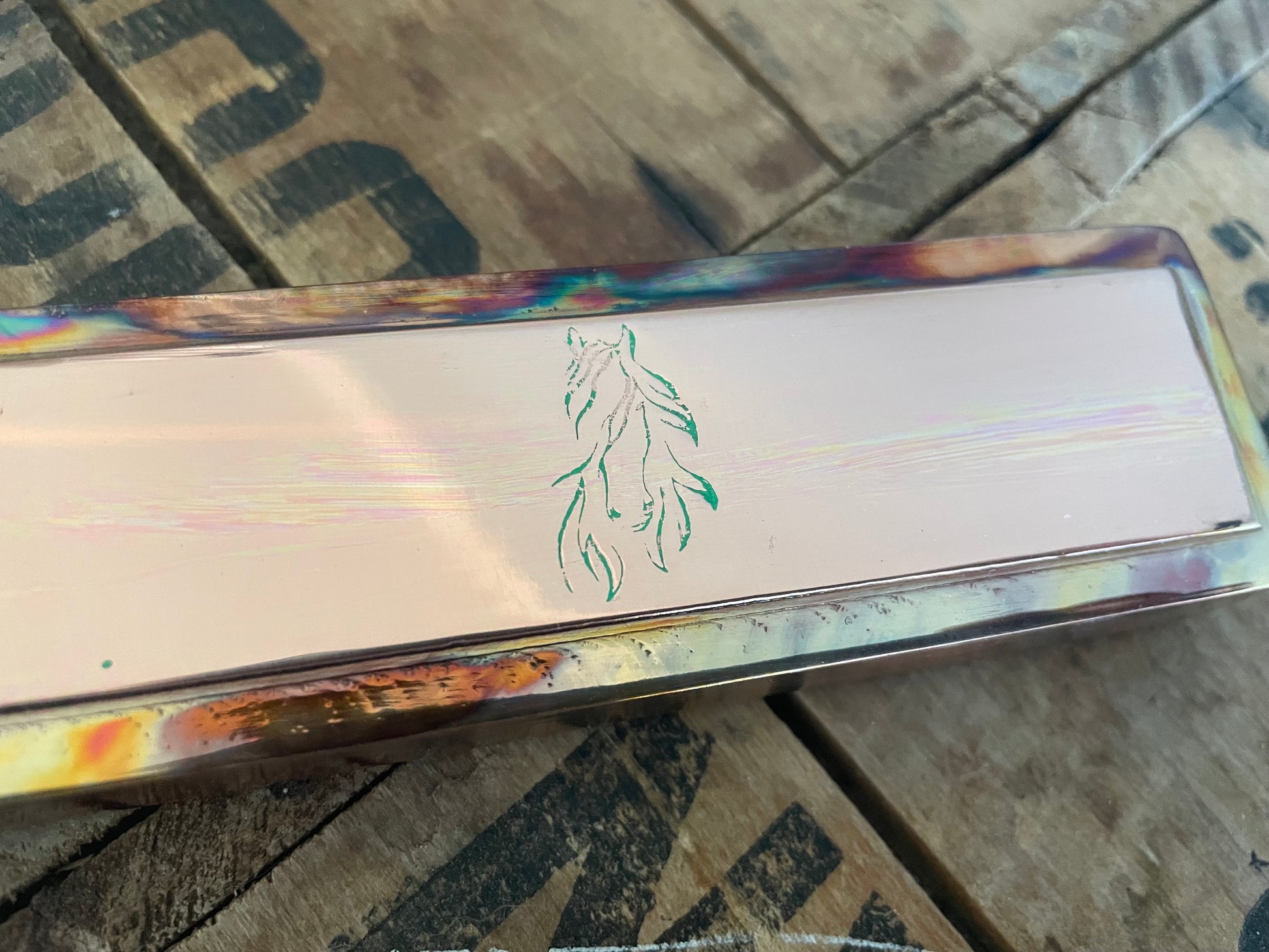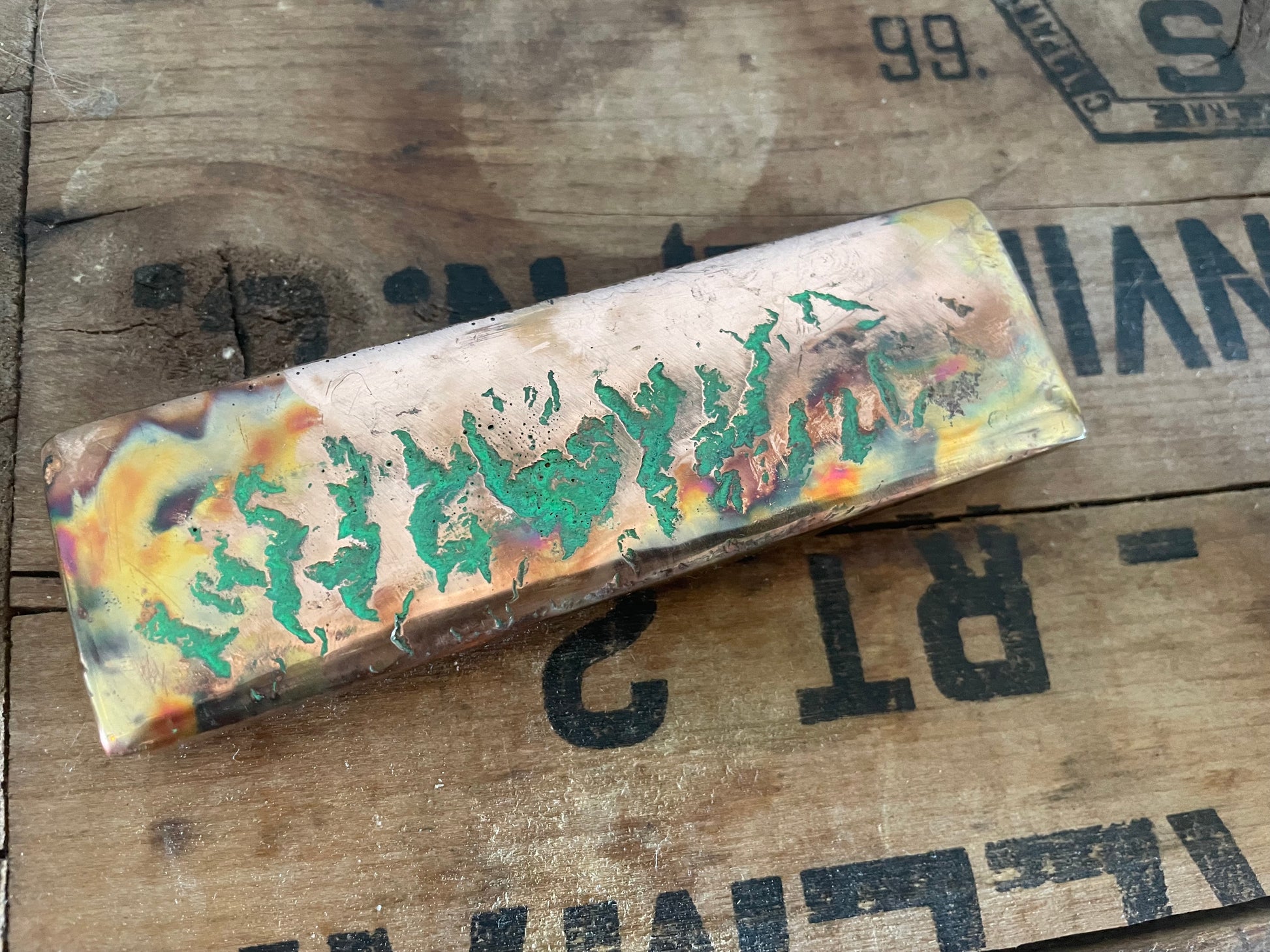 All bars are custom cast, hand poured , and hand worked . Heat painting is a technique of bringing out colors in the copper using heat in a painting technique. Incredibly tricky to do correctly the end results are absolutely gorgeous. No two bars are ever exactly the same